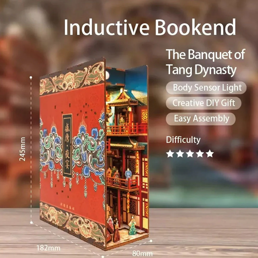 Step back in time to the elegance and romance of ancient China with the Tonecheer DIY Chinese Style Book Nook Kit. Inspired by the illustrious Tang Dynasty, this intricate 3D puzzle captures the charm of its golden age. The kit features beautifully detailed streets and authentic attire, evoking the grandeur of a Tang Dynasty banquet and making it a unique addition to any bookshelf or collection.