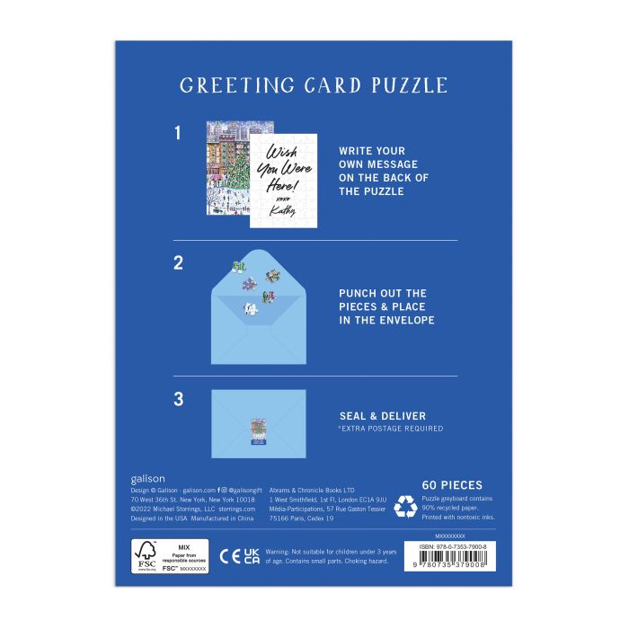 The Michael Storrings Christmas in the City Greeting Card Puzzle from Galison captures an idyllic holiday season in the city. This card format is a more interactive and fun way to send a holiday greeting. The back of the image features room for a greeting. With room on the back to write a message, you then break up the puzzle and send for family or friends to assemble and then read.