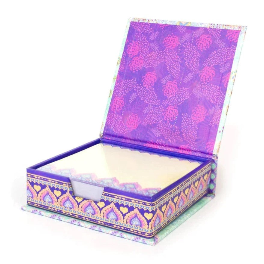 In soft greens, pretty pinks and wattle golds, the notepaper box features a swing lid adorned with an inspirational Adèle Basheer quote, beautiful boho patterning and sparkling gold foil.