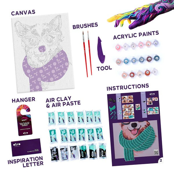 - Dual-Media Art: Start by painting the cute Corgi portrait, and then use the included air-dry clay to sculpt the 3D textured scarf, bringing a dynamic, tactile element to your artwork.