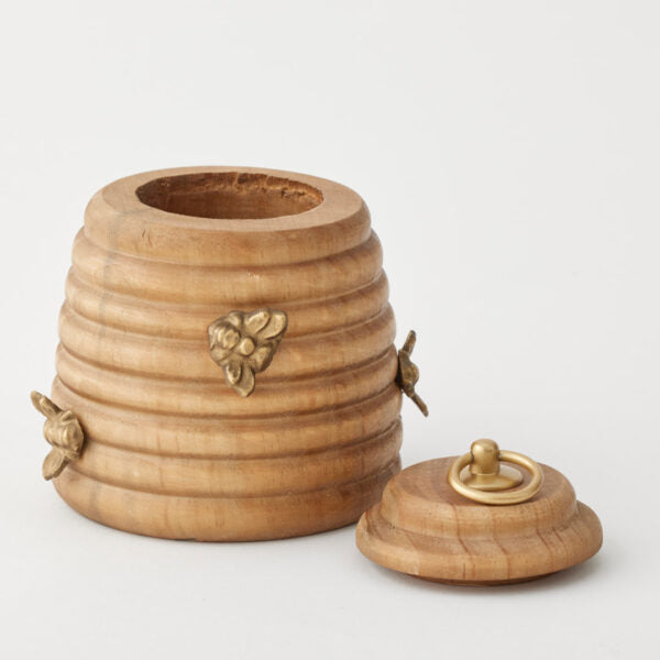 Introduce a touch of nature's elegance to your home with our charming Small Beehive Jar. Skillfully crafted from warm pinewood and accented with intricate metalwork, this delightful jar is shaped like a miniature beehive, complete with charming metal bee-inspired details gracefully adorning its surface.
