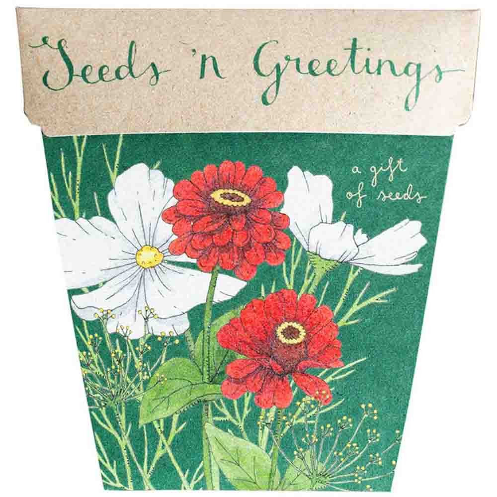 Sow n Sow Gift of Seeds Seeds 'n Greetings Gift of Seeds is a cleverly designed greeting card that makes gifting purposeful and enjoyable. It contains a mix of Cosmos, Dill and Zinnia seeds that grow in beautiful festive blooms. The card features a lovely Christmas illustration by Melbourne artist Daniella Germain that's printed with soy-based ink on 100% post-consumer waste recycled card. Sow n Sow's seeds are non-hybrid, open-pollinated, non GMO varieties sourced from reputable suppliers. The seeds are packaged in a recycled envelope with a biodegradable tear-away plant label. Send your seasons greetings to your loved one! Vegan and cruelty-free. Dimensions - 12.6 × 13.2 × 0.2 cm PLEASE NOTE WA & TAS buyers: there are quarantine regulations with sending seeds to these parts of Australia. Quarantine may inspect your parcel and if so, there is a possibility of being charged a fee of $39.50. Please be aware that Flora & Fauna accept no liability for this fee. Sow N Sow was founded in 2010 by green thumb Michelle Brady who was seeking a more creative outlet and had always dreamt of running her own business. Michelle works in collaboration with designer and illustrator Daniella Germain to create beautiful Gifts of Seeds, Flower Presses and Gift Tags. Sow n Sow believes in purposefully gifting without contributing to waste that end up in landfill. Proudly Australian made in Queensland from 100% post-consumer waste recycled paper and soy-based ink. Gift your loved ones with their beautiful products that can be enjoyed for many months as it blossoms and grows. Vegan and cruelty-free.