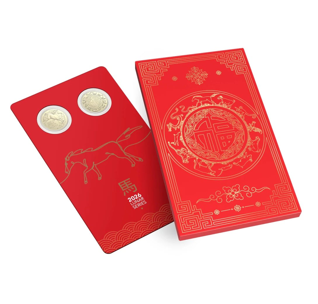 Celebrate the Lunar Year of the Horse 2026 with this beautifully presented $1 Uncirculated Two-Coin Set from the Royal Australian Mint. The Horse, the seventh sign in the Chinese Zodiac, is admired for its passion, spirit, and adventurous nature.