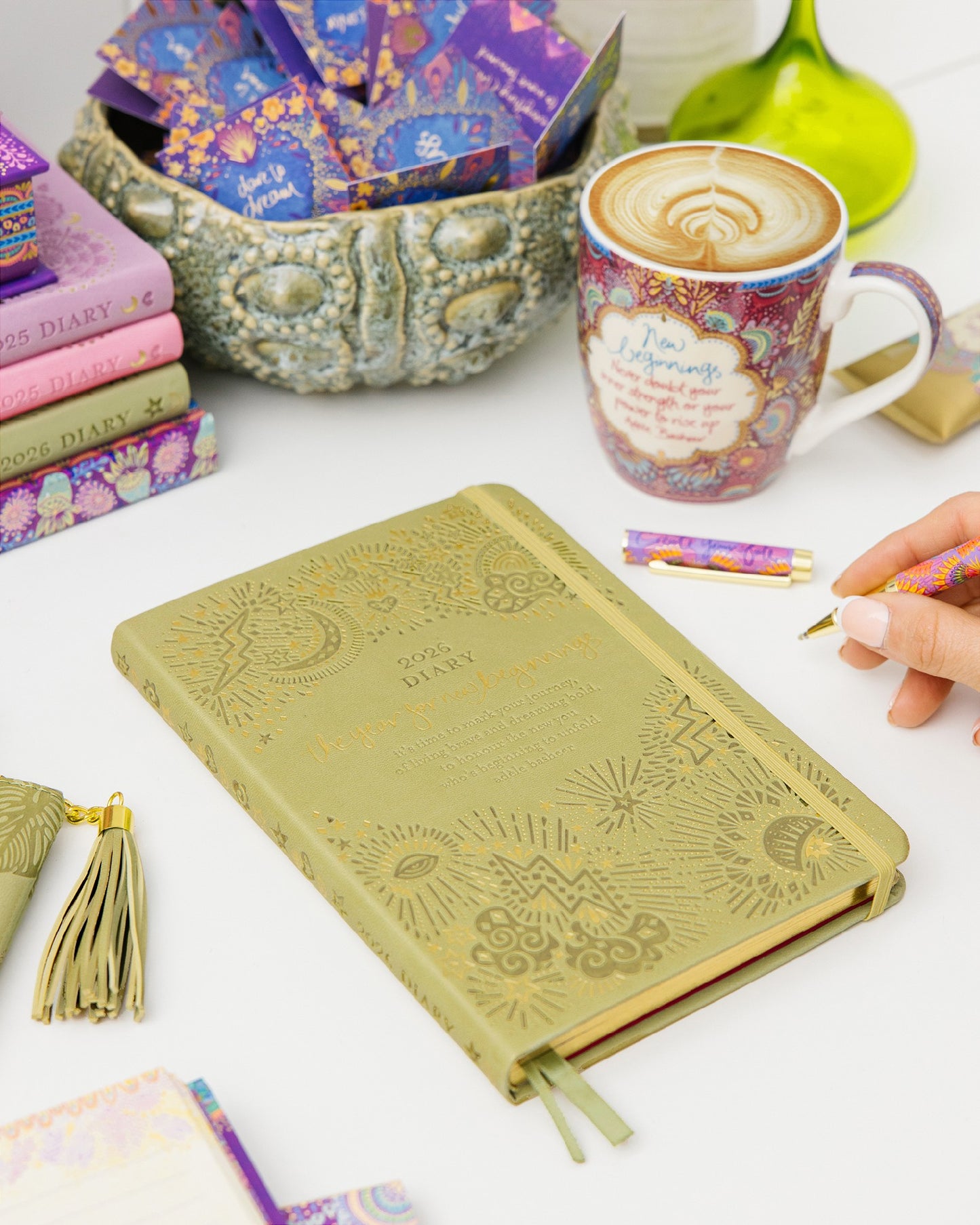 The diary's cover is a masterpiece of design, featuring intricate gold foil detailing that shimmers against the serene olive-green background. Centred on the front are the empowering words: "the year for new beginnings", setting a hopeful and forward-looking tone for the 365 days ahead. Complementing this, an inspirational quote from author Adèle Basheer encourages you to "honour the new you who’s beginning to unfold."