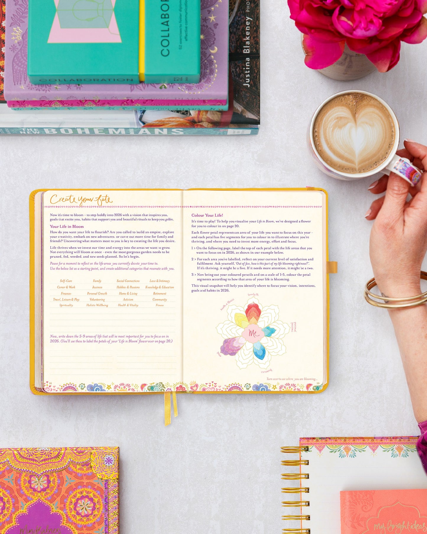 The diary's cover is a masterpiece of design, featuring intricate gold foil detailing that shimmers against the cheerful yellow background. Centred on the front are the empowering words: "the year for radiating joy", setting a bright and optimistic tone for the 365 days ahead. Complementing this, an inspirational quote from author Adèle Basheer reminds you to "radiate your light and energy toward the sparks of joy that bring sunshine to your soul, you have everything it takes to make life your own kind of wonderful."