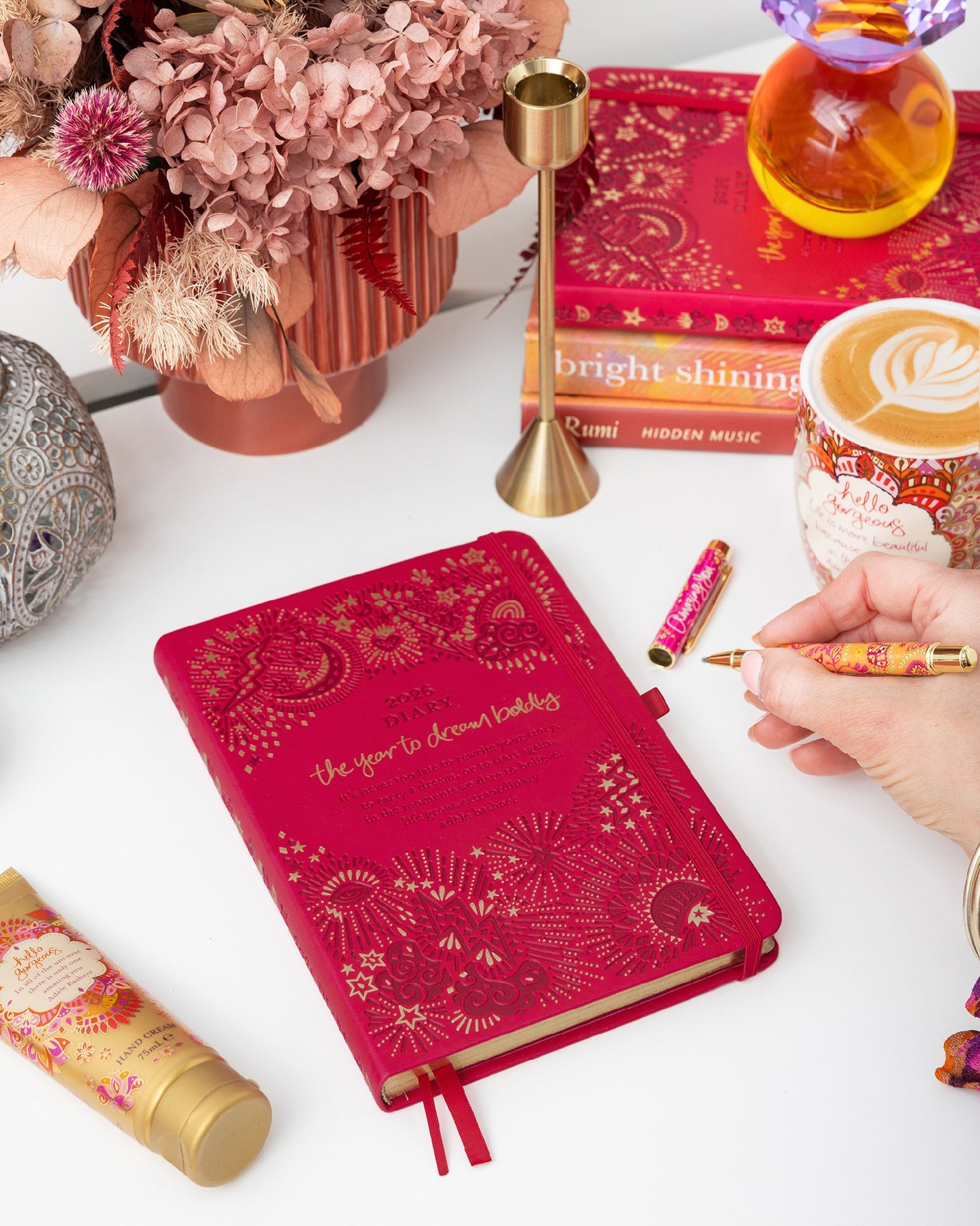 The diary's cover is a masterpiece of design, featuring intricate gold foil detailing that shimmers against the bold red background. Centred on the front are the empowering words: "the year to dream boldly", setting a passionate and determined tone for the 365 days ahead. Complementing this, an inspirational quote from author Adèle Basheer reminds you that "in the moments we dare to believe, life grows extraordinary."