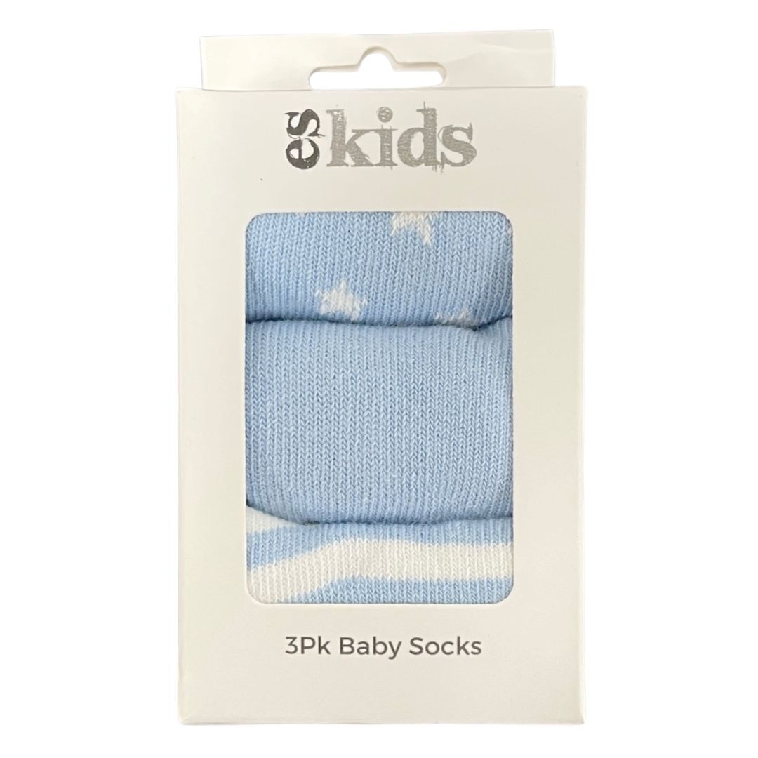 3 Pairs of Baby Socks Boxed. Each pack contains, 1 pair of bue star, 1 pair of white, and 1 pair of blue stripe socks.