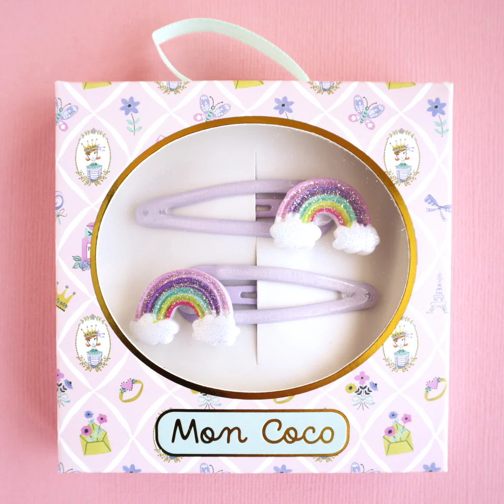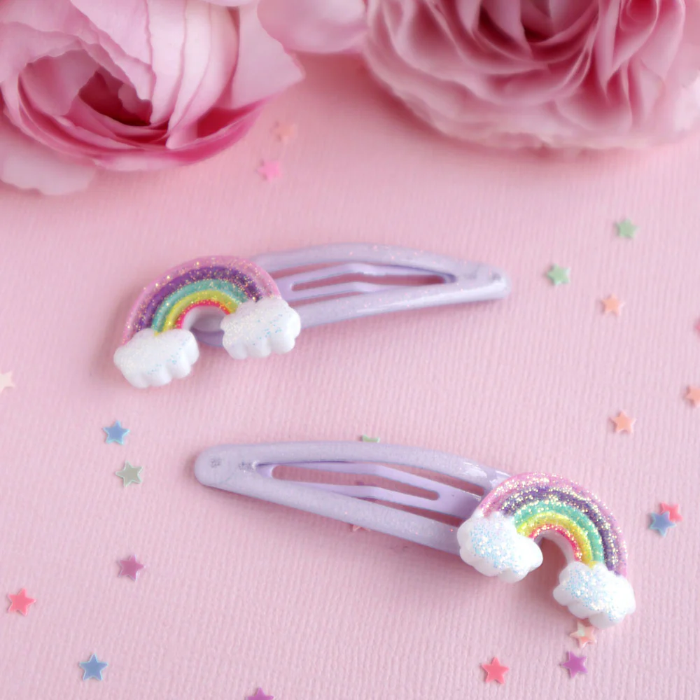 Oh my goodness, these Rainbow & Cloud Hair Clips are just utterly precious! Picture this: two fluffy, white clouds, each as soft and sweet as a dream, connected by a magnificent, glittery rainbow. It's like a tiny, magical sky has landed right in your hair!